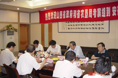 5月23日,山西省政府和山西省农垦局组成的考察组一行4人在山西省人民政府省长助理刘维佳的带领下,到安徽垦区考察农垦管理体制、国有农垦管理体制和国有资产监管情况。考察组听取了安徽省农垦集团公司董事长田文俊、副总经理程军关于农垦管理体制及国有资产监督管理情况的介绍,双方交流了农垦有关管理经验。23日晚,安徽省人民政府副秘书长张韶春和省农委副主任刘永春代表省政府在黄山大厦设宴招待了山西省政府和山西省农垦局考察组一行。24日,田文俊董事长陪同考察组赴龙亢农场参观考察。