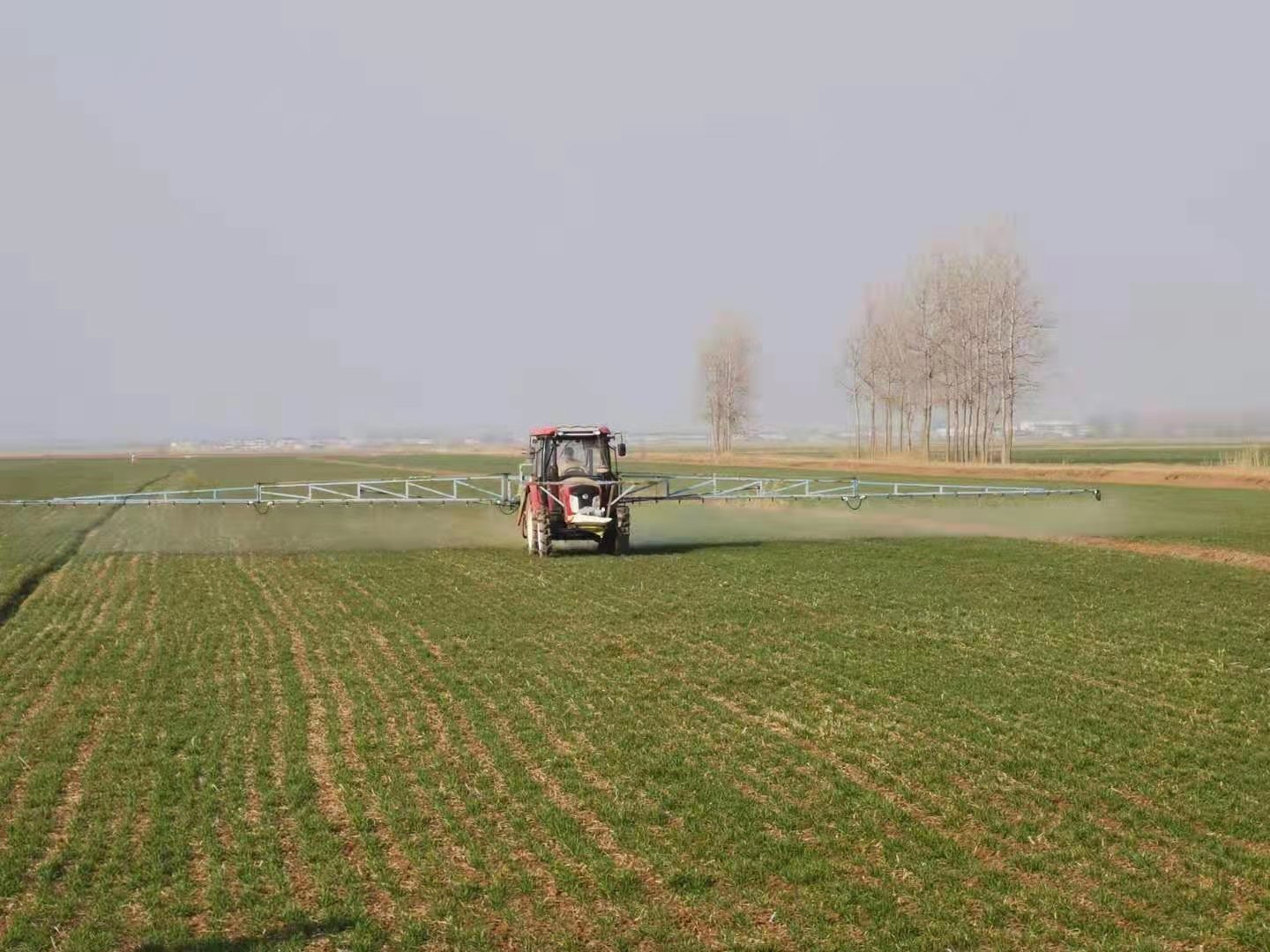 2月3日正值立春,潘村湖农场三、六分场统一经营田正在开展机械化喷防作业。(杨登宏  摄)