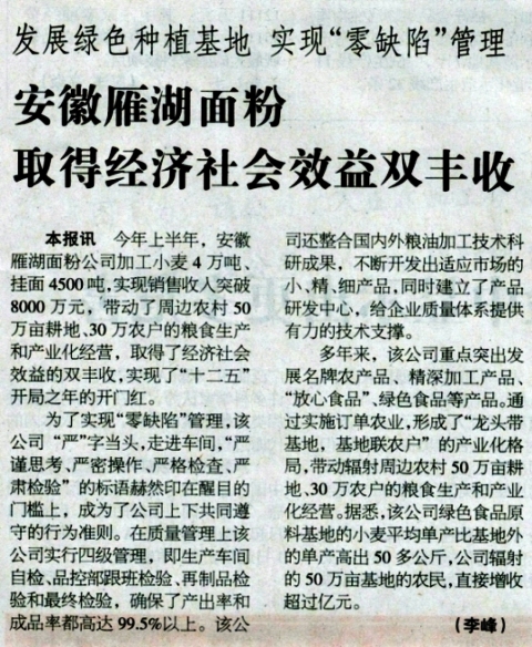 雁湖面粉公司发展受到《中国食品报》关注