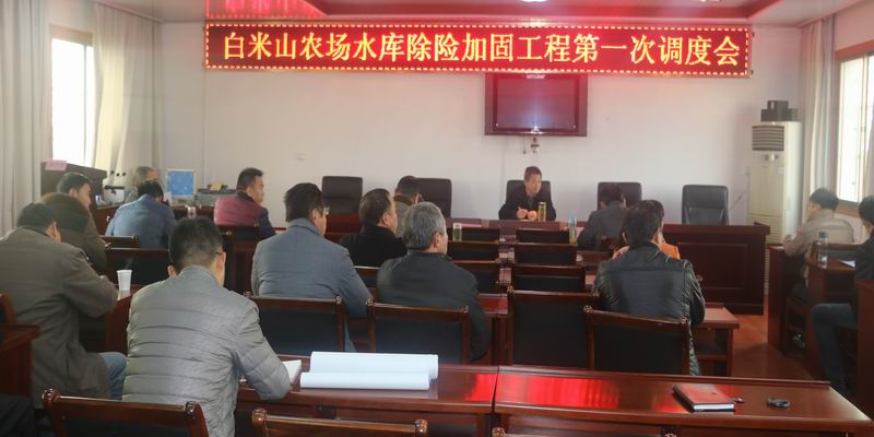 128,白米山农场召开2015年水库除险加固工程首次调度会,副场长王阳春及相关科室、分场和设计、施工、监理单位负责人参加调度,明光市水务局领导到会指导。