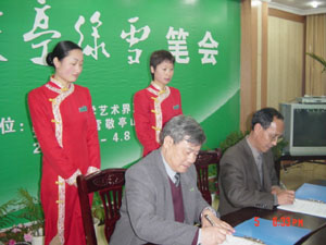 笔会的座谈会上,文艺家们在品尝名茗——敬亭绿 雪的同时,观看了安徽农业大学茶艺表演队“中华 茶艺——敬亭绿雪茶艺”表演,听取了茶叶专家有 关敬亭绿雪历史、传统工艺的恢复、敬亭绿雪的品 质和市场定位的介绍,接着文艺家与茶叶专家,就 中华茶文化的历史渊源,敬亭绿雪的品牌战略、市 场运作、产品的质量保障、产品的市场定位、产品 的规格和包装、开拓国际市场等方面进行了深入的 探讨,文艺家们提出了许多很好的建议。文艺家认 为这次文化与经济联手,名人与名茶结合,举办笔 会,是一项大胆的创新和成功的策划,是有远见的 企业家的正确决策,将对树立安徽农垦的企业形 象,打造“敬亭绿雪”品牌具有长期的重要意义。 在会场文艺家们,感受到安徽绿茶的品质,尤其是 茶中珍品——敬亭绿雪“色纯如玉、品静似天”香 醇,使他们灵感大发,当场呤诗作赋,挥毫泼墨, 给安徽农垦留下了宝贵的精神财富,陶冶了农场职 工的情操,提升了“敬亭绿雪”的文化底蕴,丰富 了农垦安徽农垦集团,必将极大地鼓舞安徽农垦人在全 面建设小康社会的伟大征程中意气风发、满怀豪情 地开创农垦事业发展的新局面。